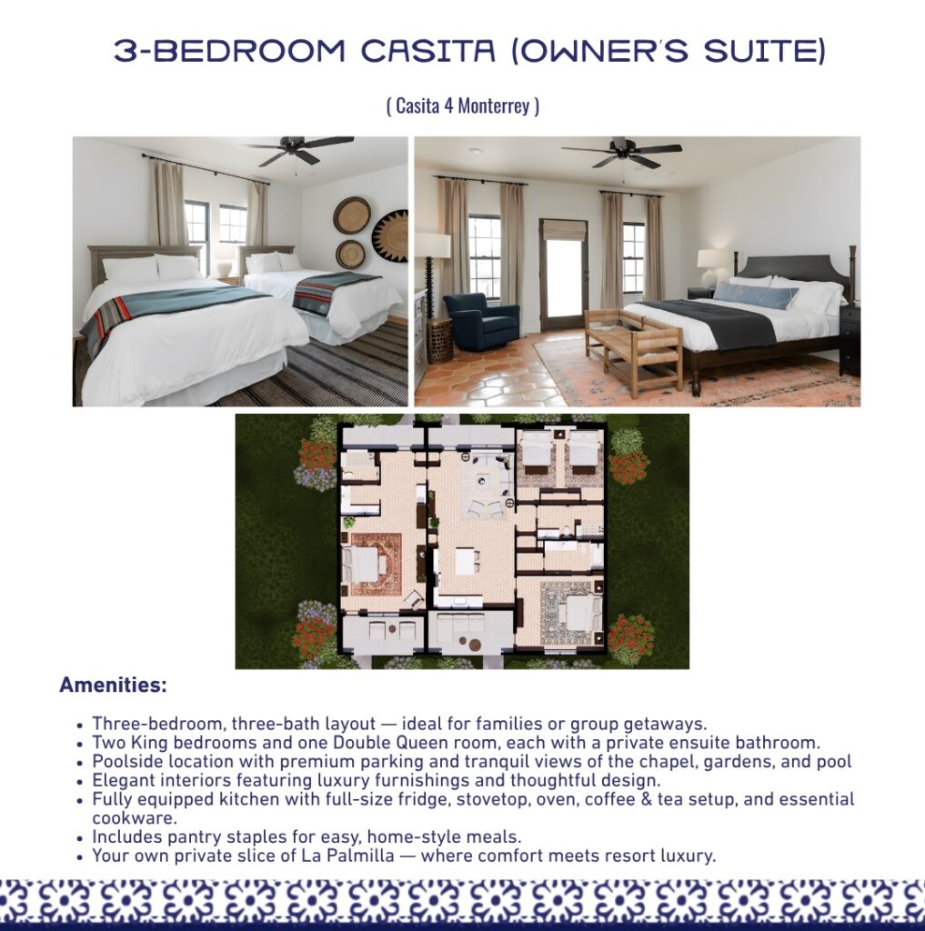 Discover refined comfort in our largest standalone casita — the Owner’s Suite. This three-bedroom, three-bath retreat features two king bedrooms and one double queen room, each with its own ensuite bathroom. Perfect for families or group getaways, it sits poolside with premium parking and serene views of the chapel, gardens, and pool. Inside, enjoy luxury furnishings and the convenience of a thoughtfully equipped kitchen with essentials for home-style meals: full-size fridge, stovetop, oven, coffee and tea setup, and a selection of basic cookware and pantry staples. It’s more than a suite — it’s your own private slice of La Palmilla.