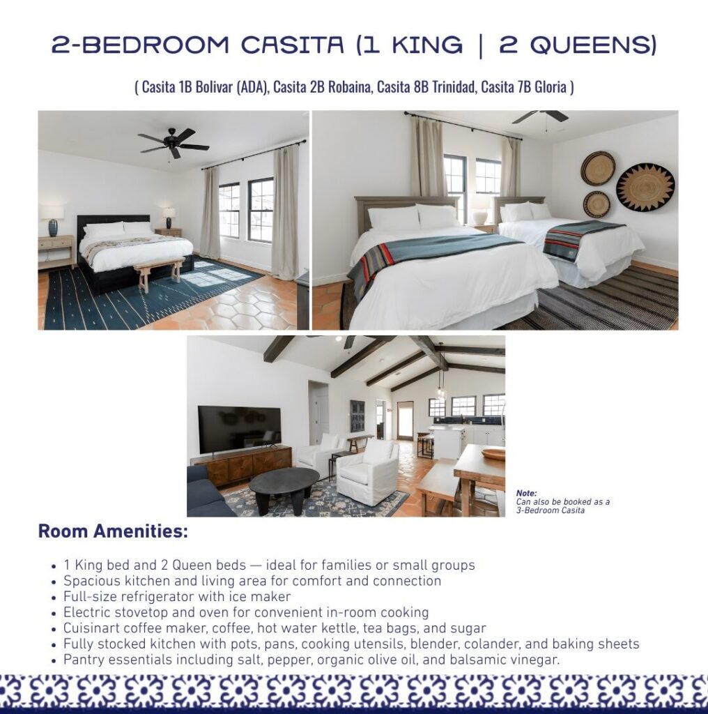 1 King bed and 2 Queen beds, Kitchen, Living Space. Embrace the freedom of your own private residence in our spacious 2-Bedroom Casita – a true home-away-from-home, not just a hotel suite. This standalone little house features a king bed and two queen beds, plus a fully-equipped kitchen where you can create family meals at your leisure.