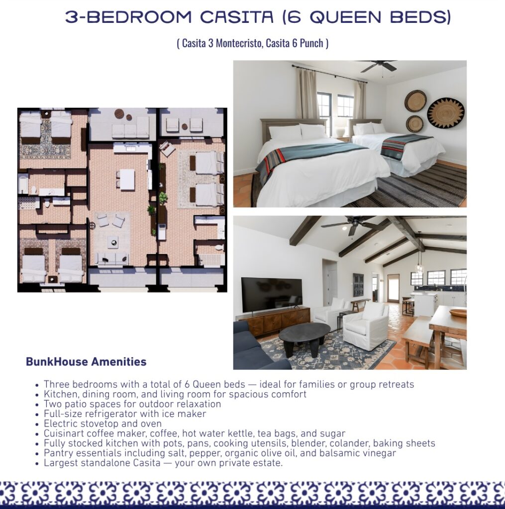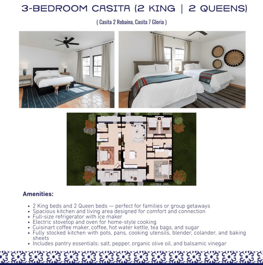 6 queen beds in a 3 bedroom Casita. Kitchen, Dining Room, Living Room, 2 patio spaces. Your own private estate awaits in our largest standalone Casita – a true three-bedroom home perfect for family gatherings or group retreats. Unlike a hotel suite, this is your personal residence with complete privacy, where you can cook family feasts in the kitchen or enjoy morning coffee on your private patio.
