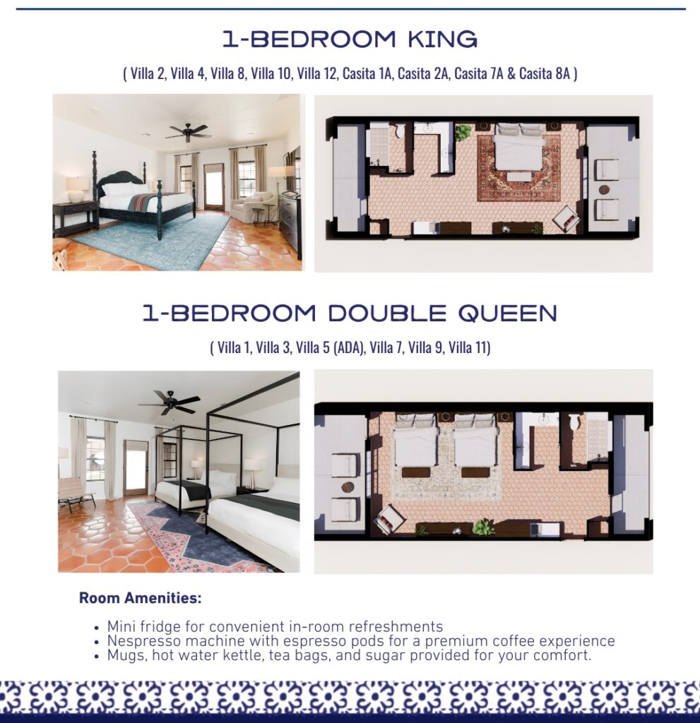 Your one bedroom king suite is uniquely and thoughtfully designed. You may request to book a double queen adjoining room!